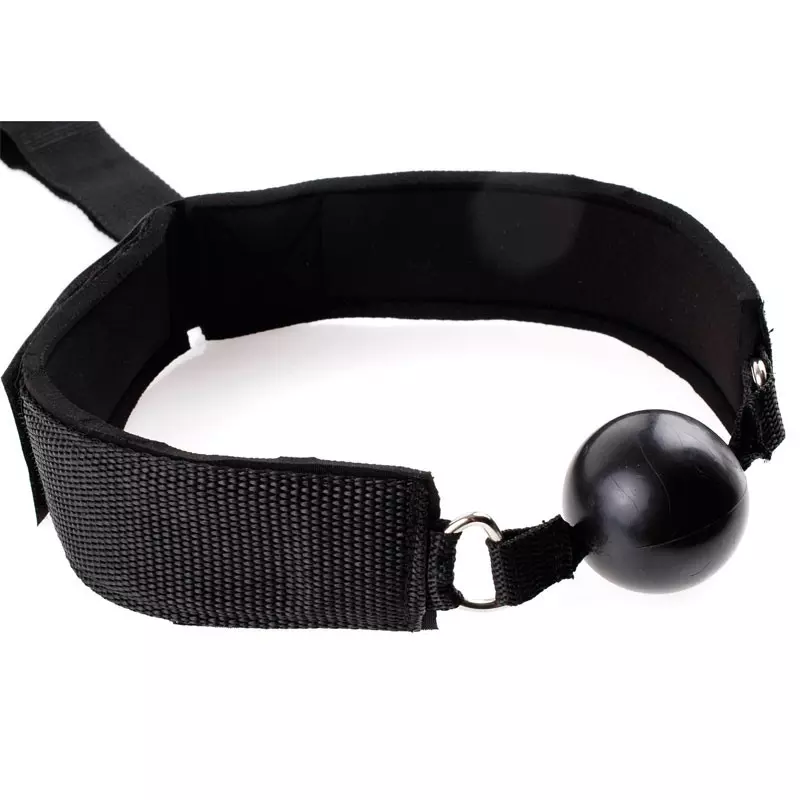 Les menottes sont elles aussi rembourrées et parfaitement ajustables. La boule en caoutchouc est fabriquée en PVC sans phtalates et mesure 4.8 cm de diamètre.