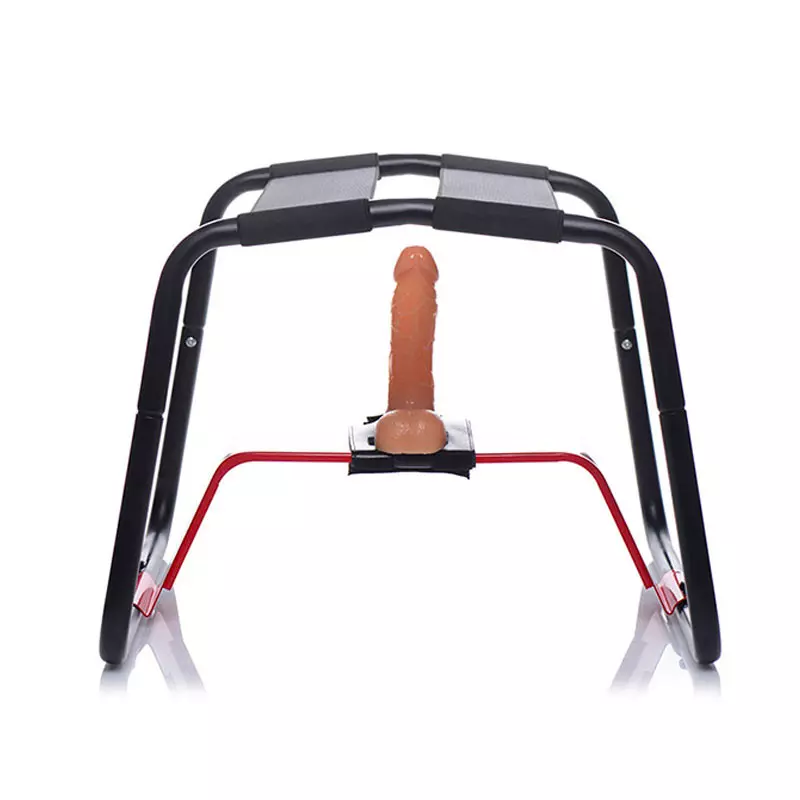 Sous l’assise un support spécifique et un harnais permettent d’accueillir un godemichet (vendu séparément) .