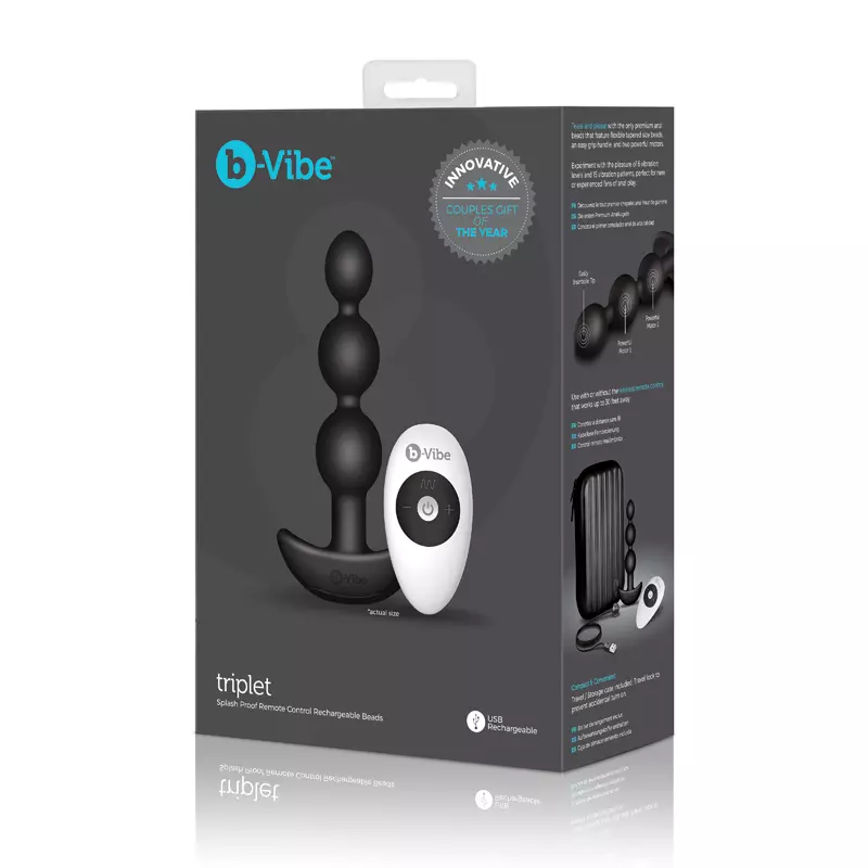 La télécommande sans fil fournie avec le « Triplet b-Vibe » vous permettra quant à elle de pouvoir contrôler votre plaisir ou celui de votre partenaire jusqu’à une distance de neuf mètres. Vous disposez de 6 vitesses et 15 modes de vibration pour faire monter le plaisir jusqu’à l’orgasme.