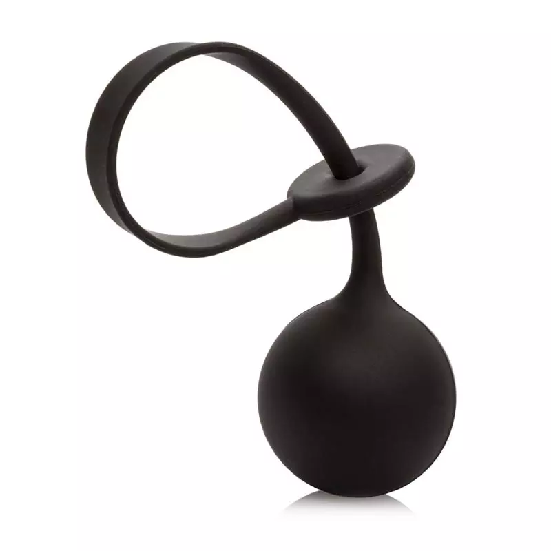 Cockring en silicone par la marque CalExotics : un lasso pénien raccordé à une balle lestée de 110 grammes, parfaite pour stimuler le scrotum mais également pour stimuler le pénis…