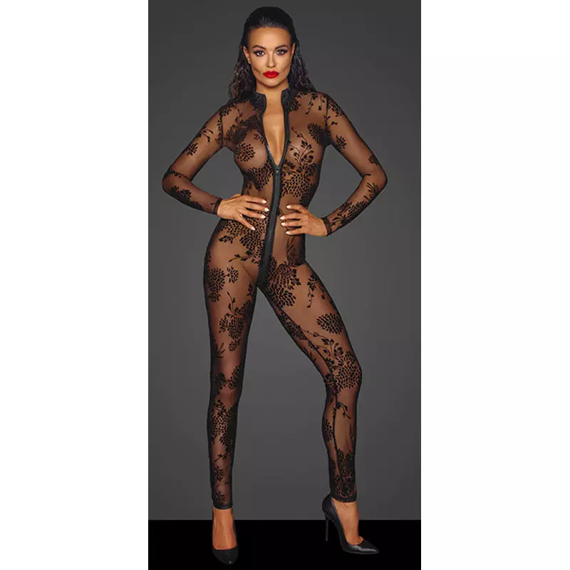 Voici le bodystocking F237 de la marque Noir Handmade, une lingerie fine à manches longues confectionnée exclusivement en tulle translucide noir orné de broderies à motifs floraux qui vous apportera féminité et confort extrême.