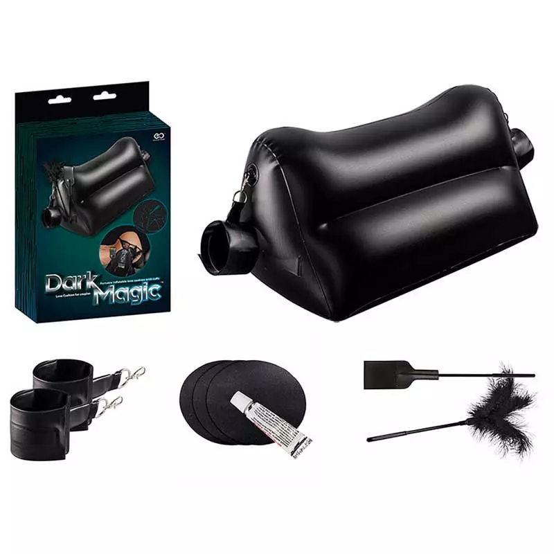 Ce coussin gonflable est livré avec un plumeau pour exciter votre partenaire, une paire de menottes pour l’attacher au coussin, ainsi qu’une cravache pour le/la punir lors de vos séances BDSM. Un kit de réparation est également inclus avec ce coussin Dark Magic Triangle
