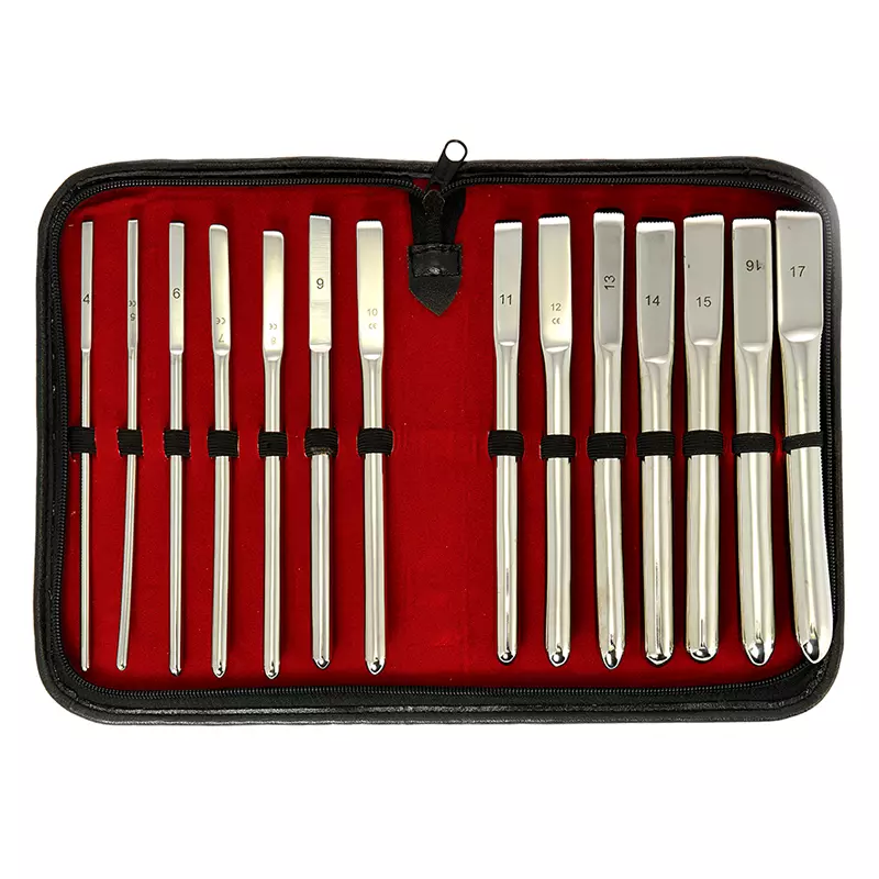 Ce kit est composé de 14 dilatateurs d’urètre allant de 4 à 17 mm. Les poignées plates permettent une manipulation aisée et peuvent être utilisées avec des pinces d’électro-sexe.