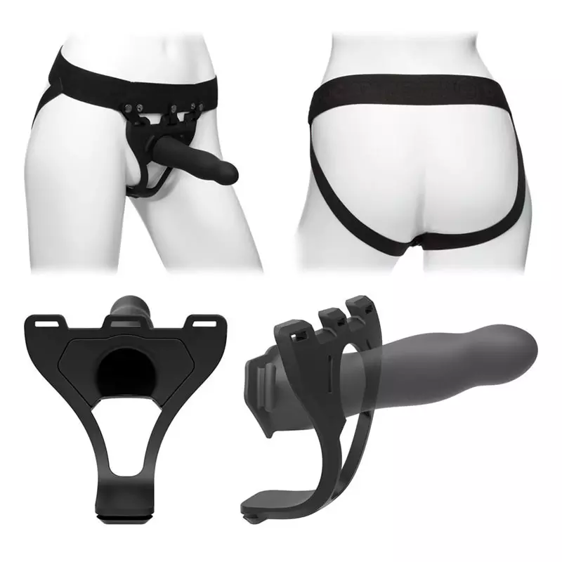 Ce set se compose d’un dildo creux et rigide, qui peut accueillir, ou non, un pénis flasque ou en érection, d’un support en silicone, permettant la fixation du dildo, ainsi que d’un harnais ajustable, équipé de larges lanières élastiques.