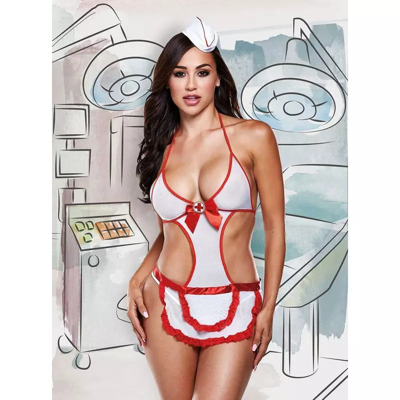 Le devant est orné d’un magnifique noeud rouge et d’une croix de premiers secours. La partie arrière et le look révélateur du dos-nu ainsi que le bonnet d’infirmière espiègle assureront un rétablissement rapide à votre partenaire.