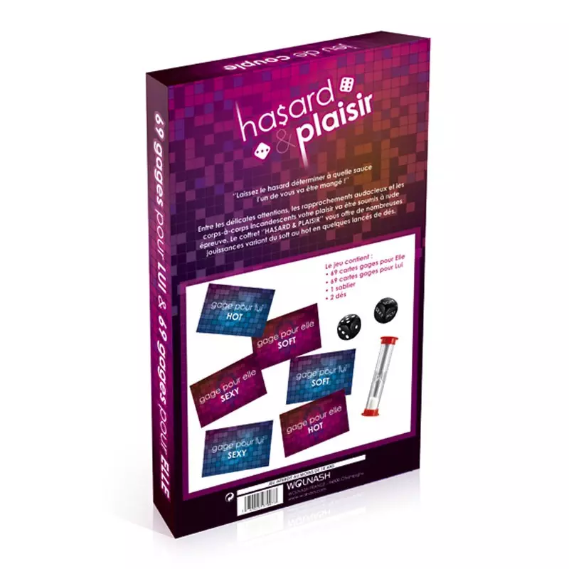 Hasard et Plaisir est constitué de 69 cartes de gages pour Elle et 69 pour Lui allant du plus soft au plus Hot.