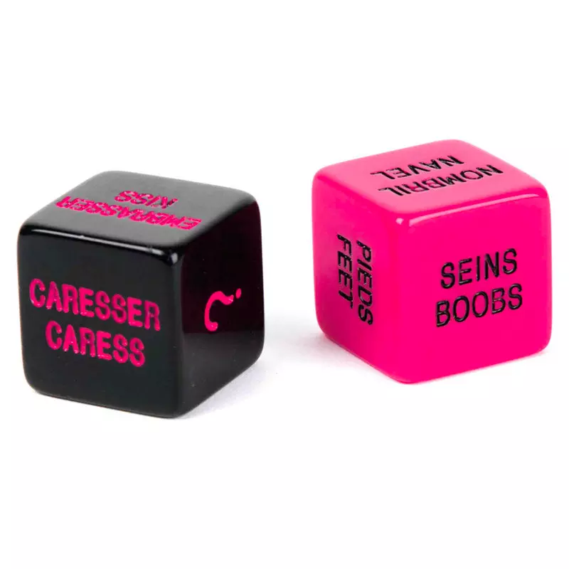 Premier dé: Seins, Lèvres, Fesses, ?, Pieds, Nombril Second dé: Embrasser, Lécher, Mordiller, ?, Caresser, Chatouiller