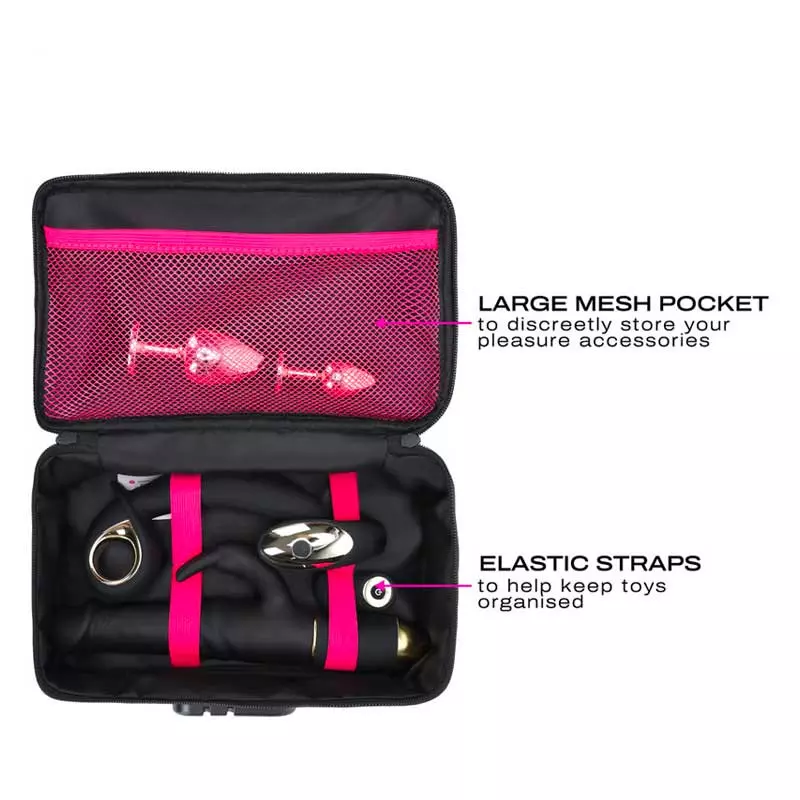 Les dimensions généreuses de cette boîte lui permettent d’accueillir entre 4 et 5 sextoys de taille moyenne. À l’intérieur, vous disposez d’une pochette élastique qui maintiendra parfaitement vos jouets intimes et autres produits d’entretien.