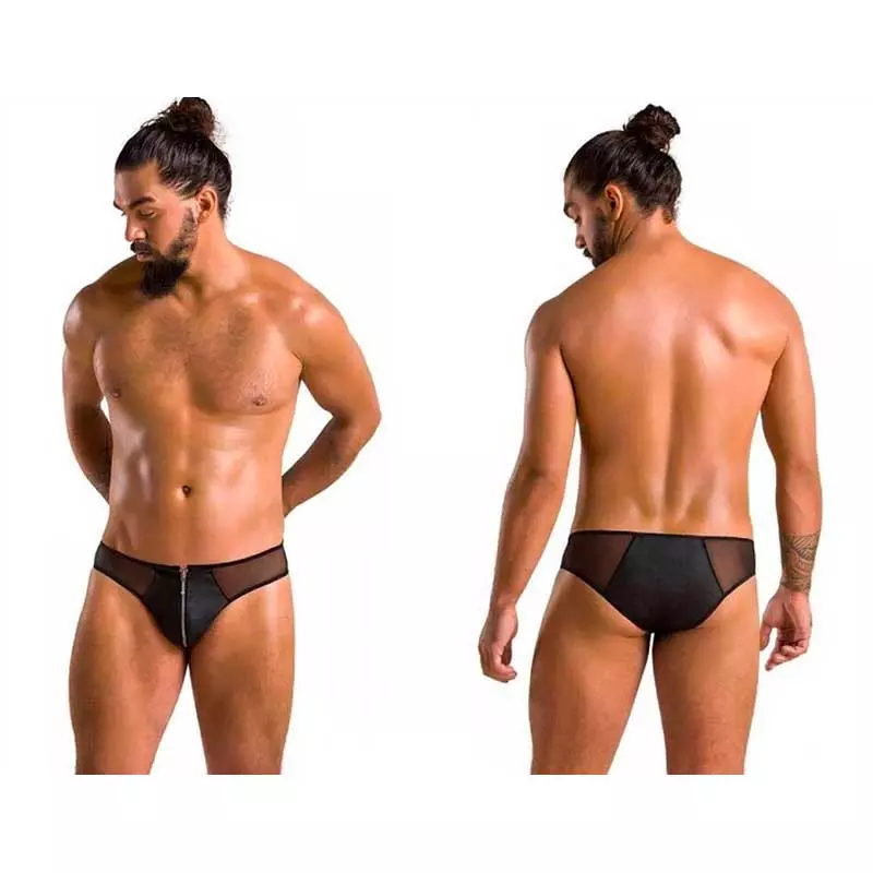 Voici le slip 042 Timmy proposé par Passion Lingerie, une lingerie sexy masculine conçue dans un tissu semi-transparent sur les hanches avec un effet mouillé ultra doux sur devant et derrière.