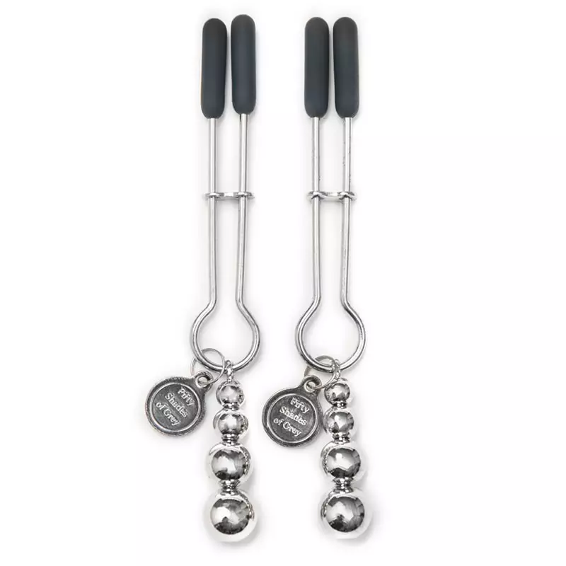 Les pinces à seins Fifty Shades of Grey sont idéales pour les jeux BDSM en couple. Elles apportent une sensation de mordillement ou carrément de morsure si celles ci sont ajustées à leur maximum. Elles sont munies de petites billes métalliques et sont ornées d’un petit pendentif comportant l’inscription Fifty Shades of Grey.