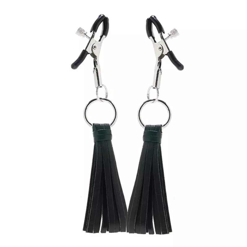 Cette paire de pinces à seins est constituée de 2 anneaux métalliques sur lesquels vous pourrez fixer une petite chaîne et de deux petits fouets.