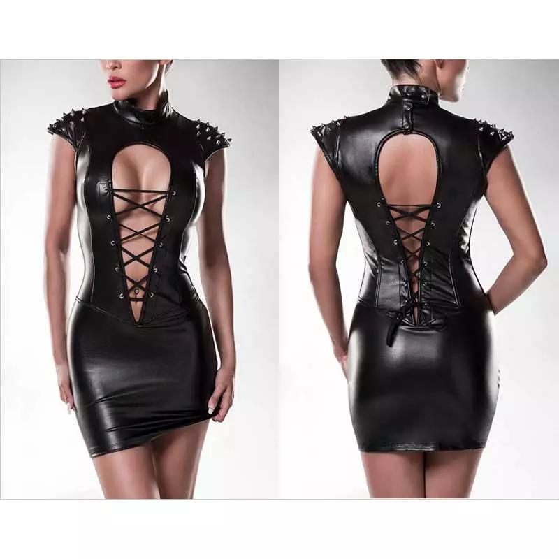 Le devant est sublimée par des armatures intégrées et laisse apparaître délicieusement votre poitrine sous les laçages, alors que le dos est dévoilé par un effet corsage. Le col près du cou et les épaulettes à piques lui confèrent une allure très provocatrice et excitantes.
