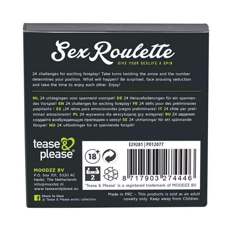 Voici Sex Roulette, le tout dernier jeu proposé par la marque Tease and Please. Relancez l’excitation érotique de votre vie de couple avec un seul coup de flèche du tableau.
