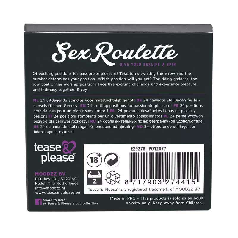 Voici Sex Roulette, le tout dernier jeu proposé par la marque Tease and Please. Relancez l’excitation érotique de votre vie de couple avec un seul coup de flèche du tableau.