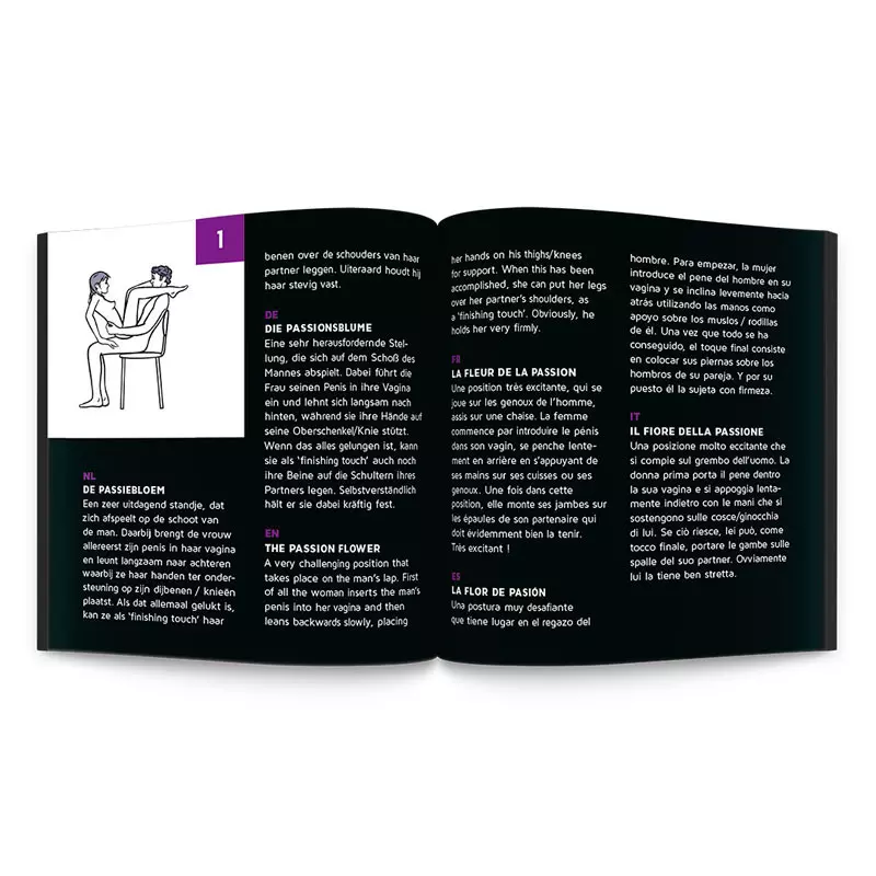 Les 24 positions de l’édition Kama Sutra sont disponibles en 10 langues: anglais, espagnol, français, allemand, néerlandais, polonais, russe, italien, suédois et norvégien.