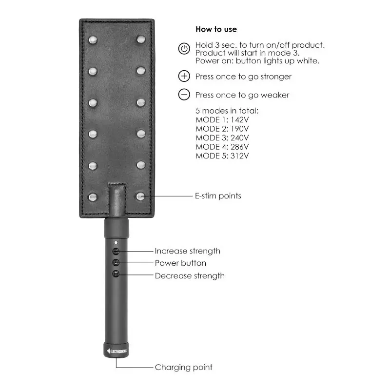 La tapette BDSM est équipée de 12 capteurs électriques de chaque côté qui peuvent être contrôlés par les 3 boutons situés sur la poignée (on/off, plus et moins). Les possibilités de tension vont de 142 V à 312 V en seulement 5 étapes !